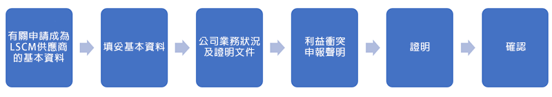 欲成為LSCM的供應商須提交需要的資料以完成供應商登記的程序。LSCM會保留申請人提供的公司、產品、服務等資料,以便日後進行聯繫及採購工作。
